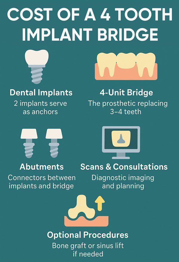 The cost of a 4 tooth implant bridge typically includes several crucial components: