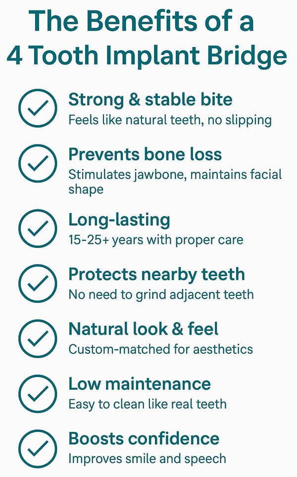 The benefits of a 4 tooth implant bridge are numerous. Here are some of the significant advantages: